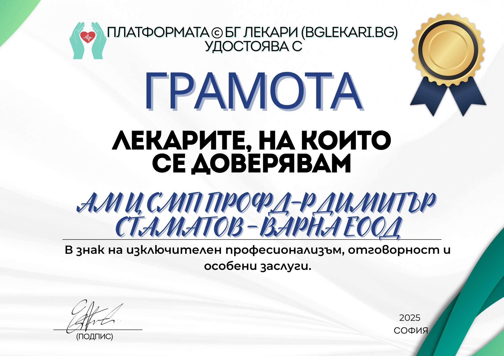 "Заслужаваш правото да повериш здравето си в ръцете на професионални, коректни, можещи лекари с бистър ум, сръчни ръце, чисто сърце."